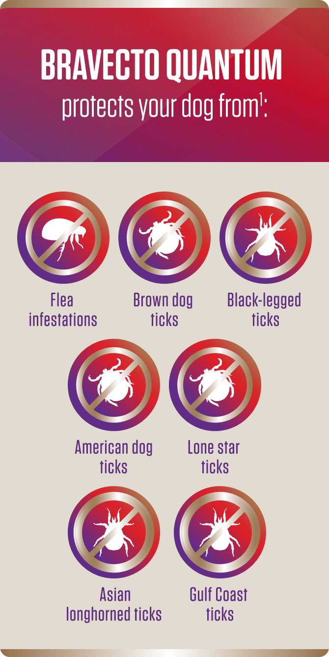 *BRAVECTO QUANTUM kills adult fleas, prevents flea infestations and treats and controls ticks (black-legged tick, American dog tick, brown dog tick, Asian longhorned tick and Gulf Coast tick) for 12 months. BRAVECTO QUANTUM also kills lone star ticks for 8 months.